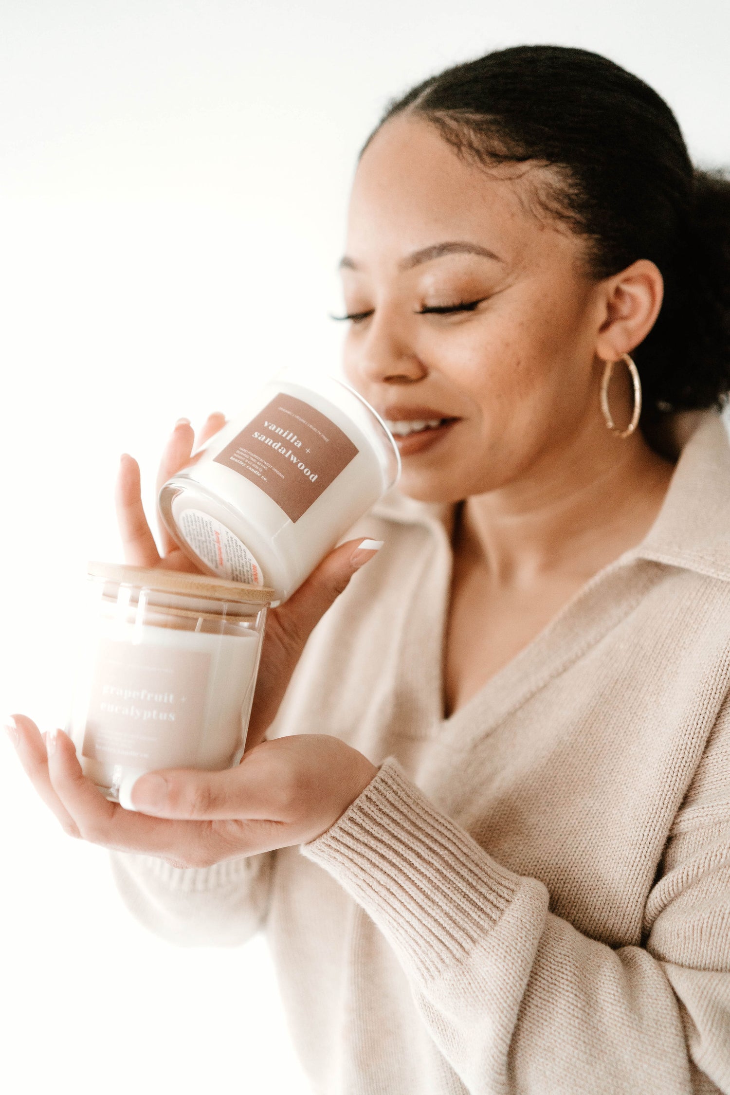 Love, love, LOVE these candles! The perfectly balanced fragrances are strong enough to fill my house, yet not over powering. This particular scent (Grapefruit + Eucalyptus) surprised me. I didnt expect to love it, as Im normally a bakery scent girlie but its the perfect balance of fruity and clean. It has been great for a calming smell in my bedroom!